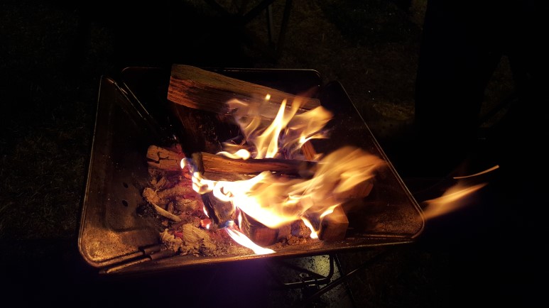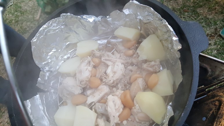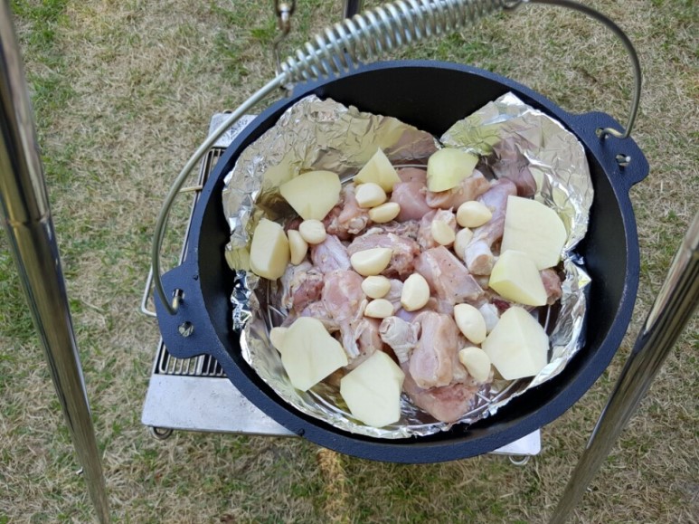 해가 기울어 가길래 남편이 전날 씨즈닝해 놓은 닭고기를 더치 오븐에 넣고 모닥불로 은근하게 익혀주었다.