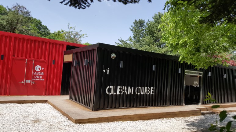 C구역에 위치한 컨테이너 샤워장과 화장실 개수대.