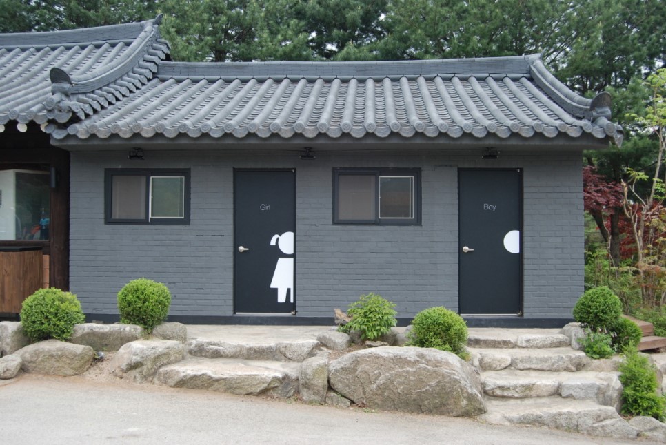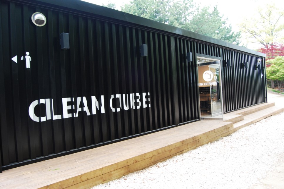 검정색 건물의 앞쪽은 개수대, 뒷쪽은 화장실이 있고