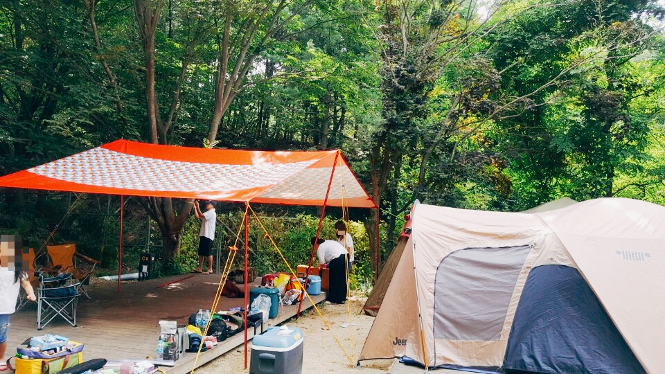 두가족이기때문에 한싸이트에는 텐트를 다른싸이트에는 타프를 쳐서 주방으로 꾸몄어요^^