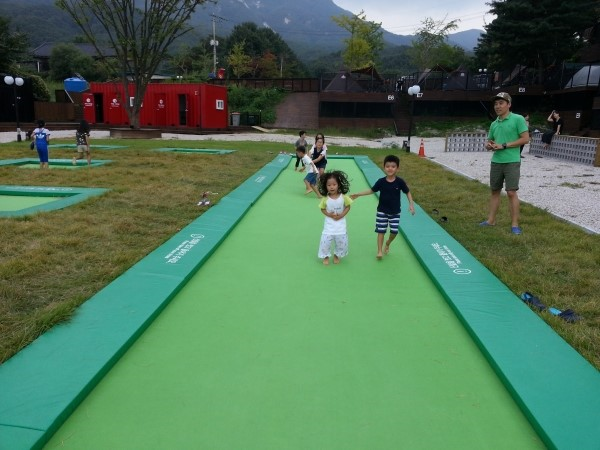 특이한 방방이, 좌우에 잔디가 곱게깔려있고 안전하게 두툼한 매트가 좌우에 깔려있는 방방이다.