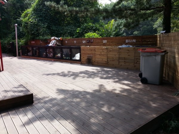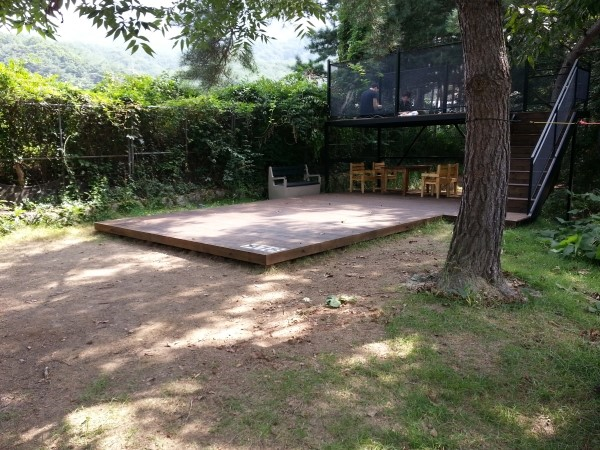 좌측으로는 이단삼단 쌓아올린 데크들이 잣나무와 소나무 그늘아래 자리하고 있다.